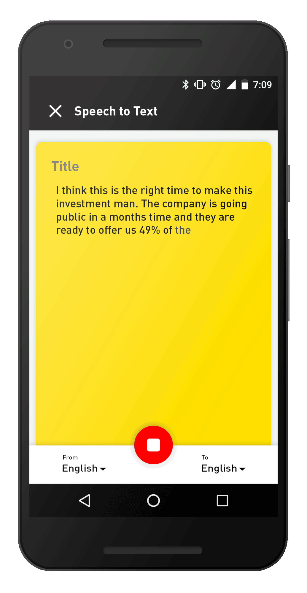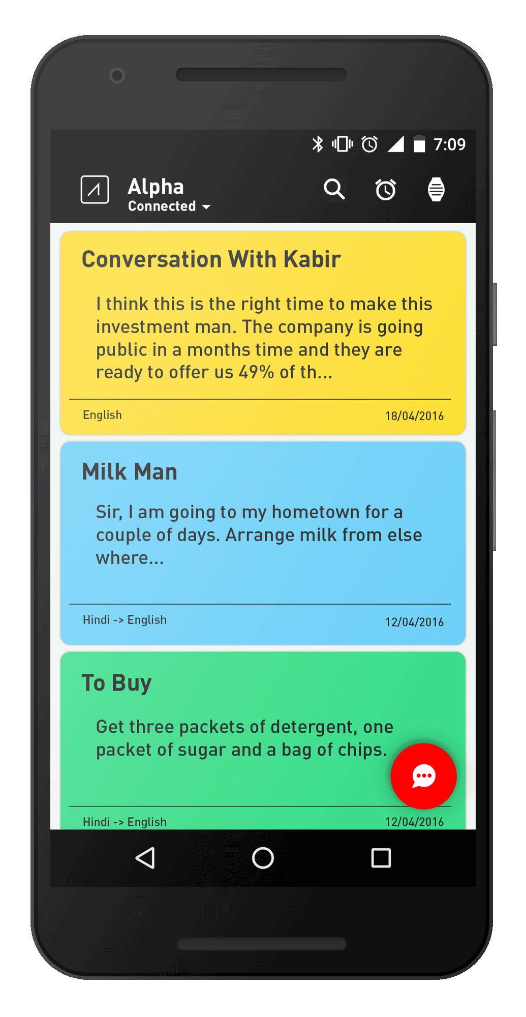 Easy one touch access to speech to text conversation was most important to enhance the experience. Here with a press of the assist button, the Alpha app is triggered on your smartphone and it automatically starts converting the voice input to text in you preferred language.