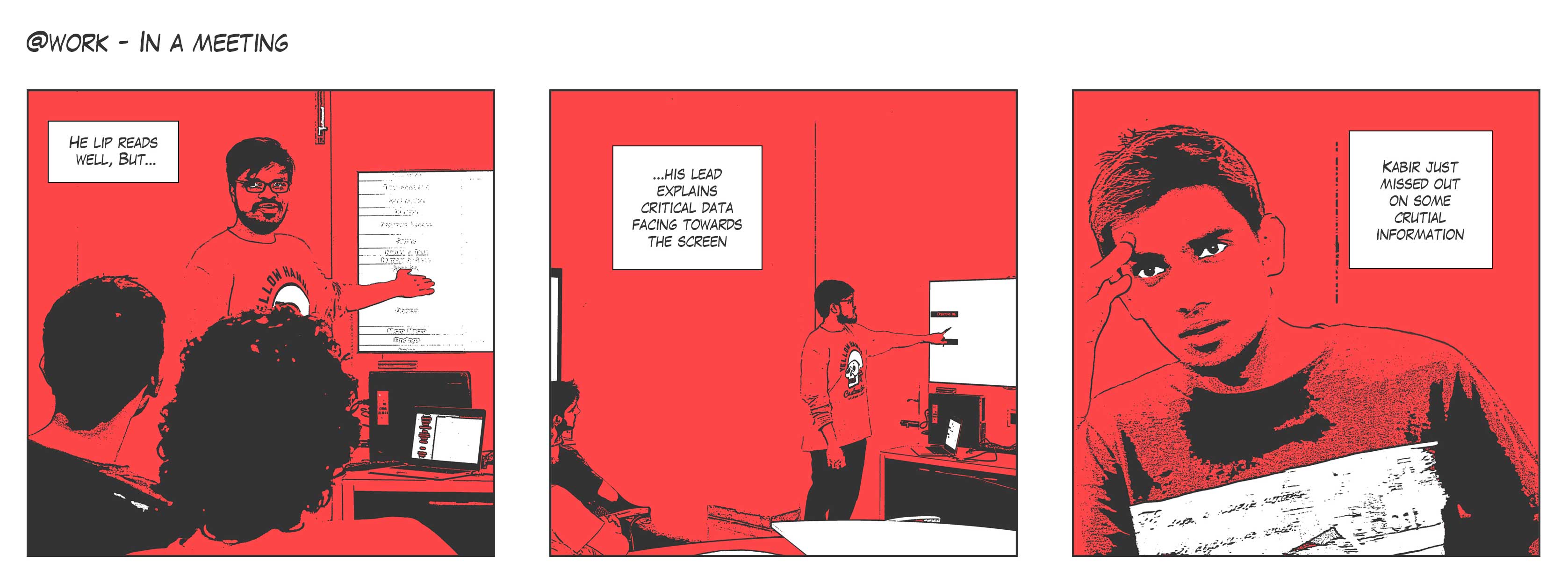 My research emcompasses identification of common problems that people with deafness or hard for hearing face on a daily basis and how can design intervene and help solve some of those issues.