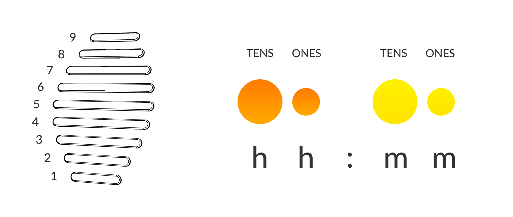 Deca is revolutionary new way to view time. Bound to turn heads and make a statement, any number can be represented with a combination of digits 0 to 9. Alpha has 9 LED that represent digits 1-9 numbered bottom to up. The hours and minutes both can be divided into two digits ones and tens. The hour ones represented by the smaller orange circle the tens with the larger orange. The minute in the same way represented by yellow circles.
